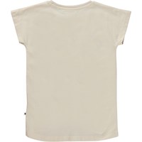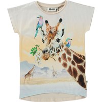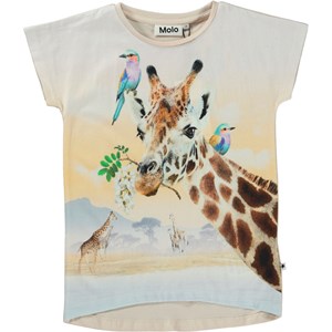 Ragnhilde is a t-shirt with short sleeves and a print of a giraffe and small birds. The t-shirt is longer in the back.