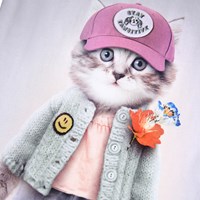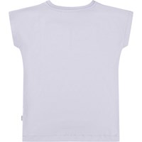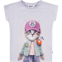 Purple short-sleeved T-shirt made of organic cotton with a front print of a cat in Molo clothing. The T-shirt has a regular fit, small short sleeves, a ribbed neckline and is longer at the back than at the front.