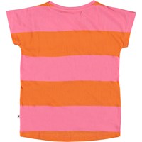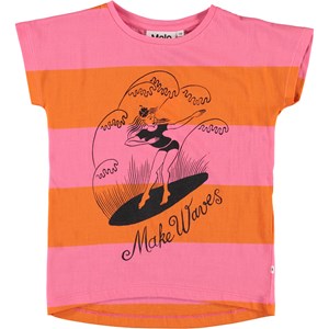 Ragnhilde is a striped t-shirt, with very short sleeves, in orange and pink with a surfer girl print on the front.