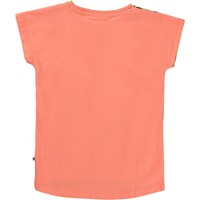 Ragnhilde is an orange and yellow t-shirt with short sleeves and a print of a floral wreath around the neck. The t-shirt is longer in the back.