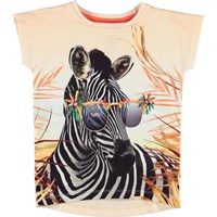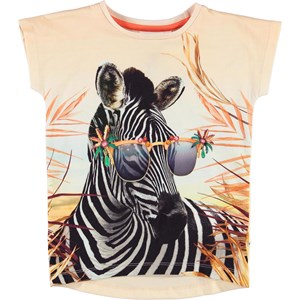 Ragnhilde is a t-shirt with short sleeves and a fun print of a zebra with sunglasses surounded by palm leaves. The t-shirt is in 100% cotton.