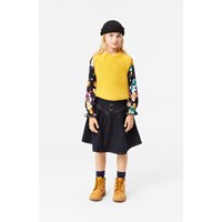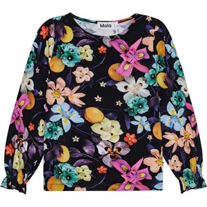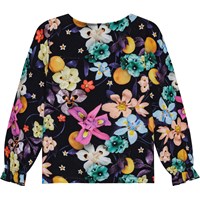 Long-sleeved black top in organic cotton with a print of colourful flowers. The top has a round neckline, sleeves with gathers, and elastic at the wrist, adding a small ruffle.