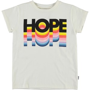 Ranva is a white t-shirt with the text 'Hope' on the front, written like a rainbow.