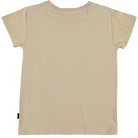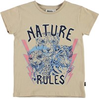 Ranva is a beige t-shirt with a print on the front of a snow leopard and the text 'Natur Rules'.