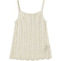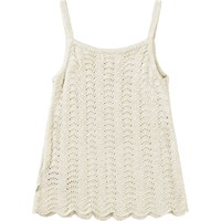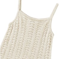 Loose beige top with crocheted pattern, narrow straps, and a delicate wavy crocheted edge at the bottom. Pair the top with matching shorts.