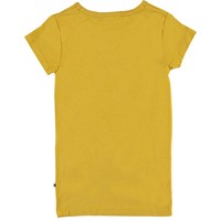 Rasmine is a yellow basic t-shirt with a round neck and short sleeves.
