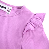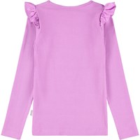 Purple long-sleeved fitted top made of soft organic cotton rib with a round neck and ruffle detail at the shoulder.
