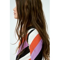 Ravonda is an asymmetrical top with only one long sleeve. It has diagonal stripes.