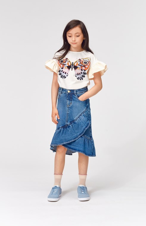 Rayah is a white t-shirt with a print of flowers with animal heads. The t-shirt has short ruffle sleeves.