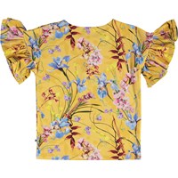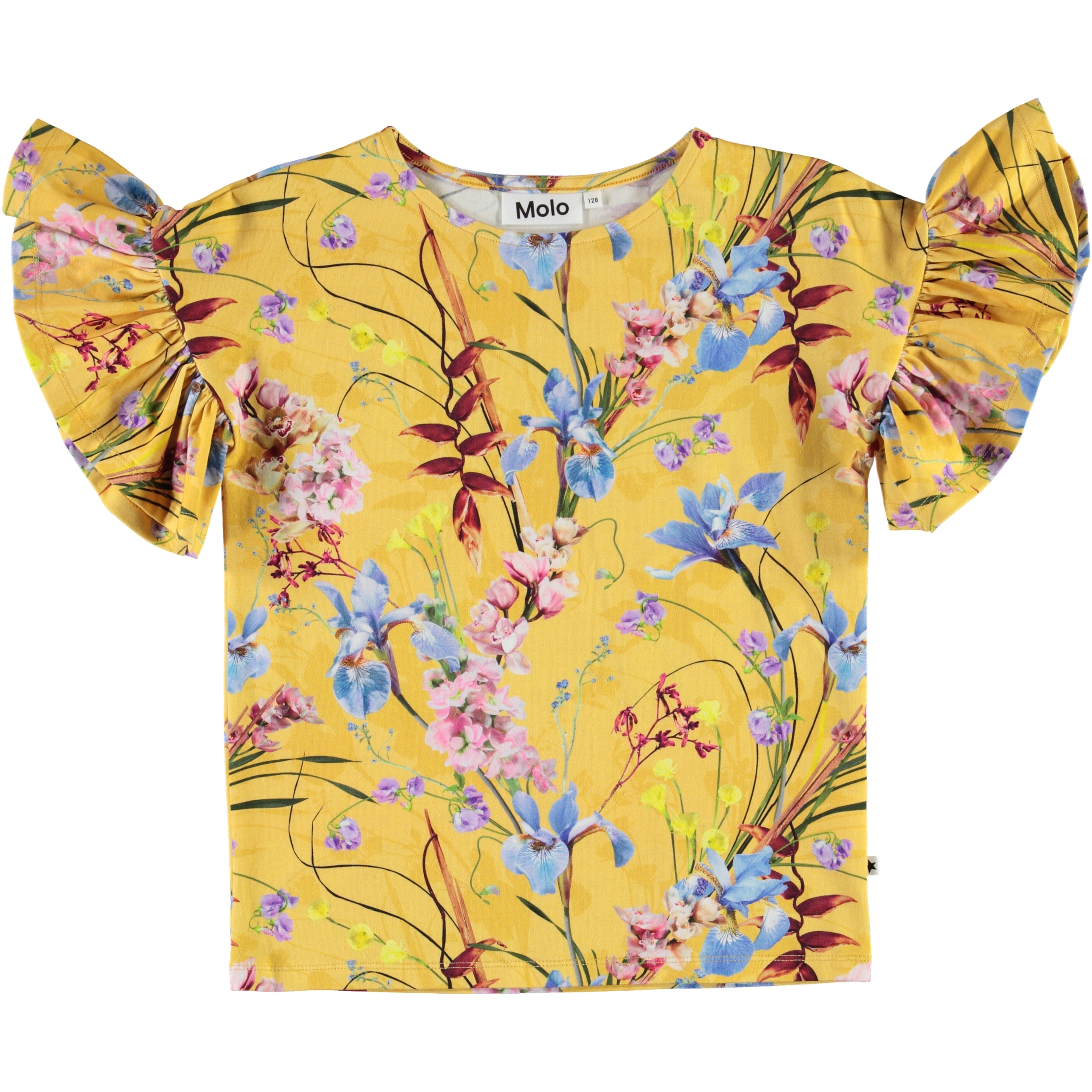Rayah is a beautiful golden yellow t-shirt in an all-over floral print. It has short sleeves and a ruffle edge.