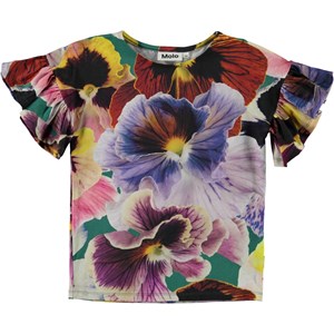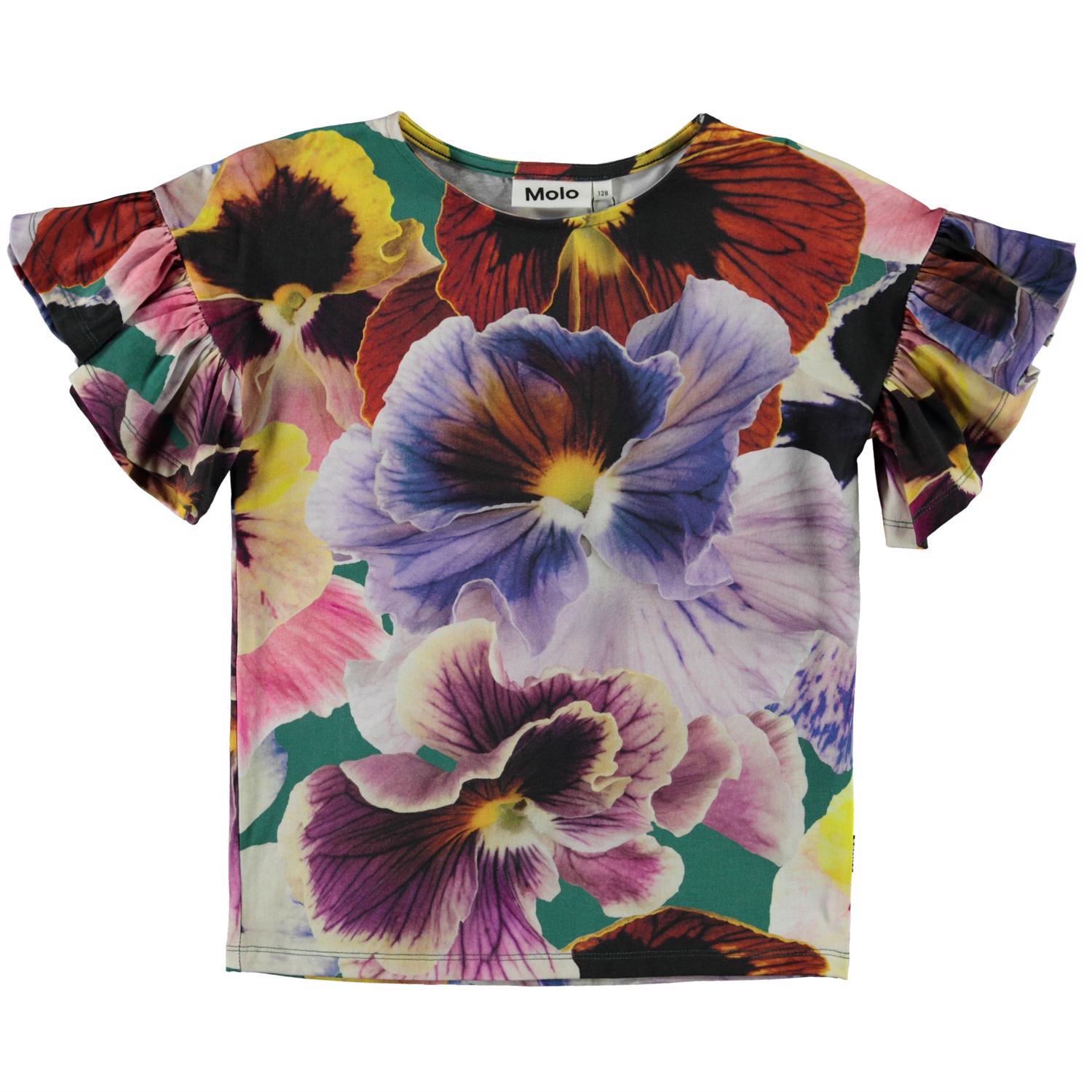 Rayah is a t-shirt with a print of large flowers. The t-shirt has short ruffle sleeves.