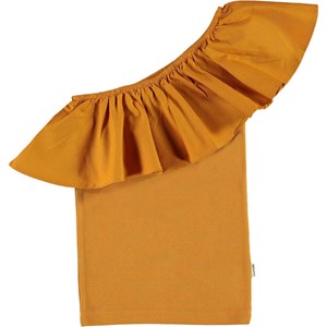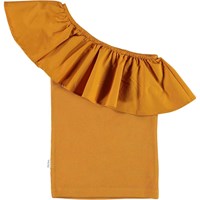 Rebecca is a brown asymmetrical top with a slanted ruffle edge.