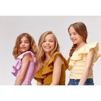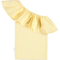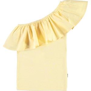 Rebecca is a light yellow asymmetrical top with a slanted ruffle edge.
