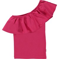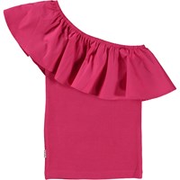 Rebecca is a dark pink top in organic cotton with one shoulder strap. The body of the top is in a stretchy material with a beautiful, large poplin ruffle across the front and back shoulder.