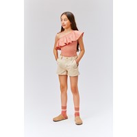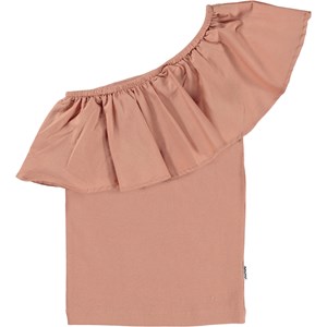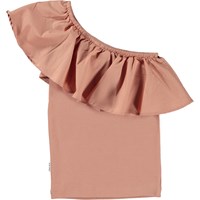 Rebecca is a dusty rose top in organic cotton with one shoulder strap. The body of the top is in a stretchy material with a beautiful, large poplin ruffle across the front and back shoulder.
