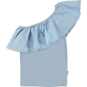 Rebecca is a light blue top in organic cotton with one shoulder strap. The body of the top is in a stretchy material with a beautiful, large poplin ruffle across the front and back shoulder.