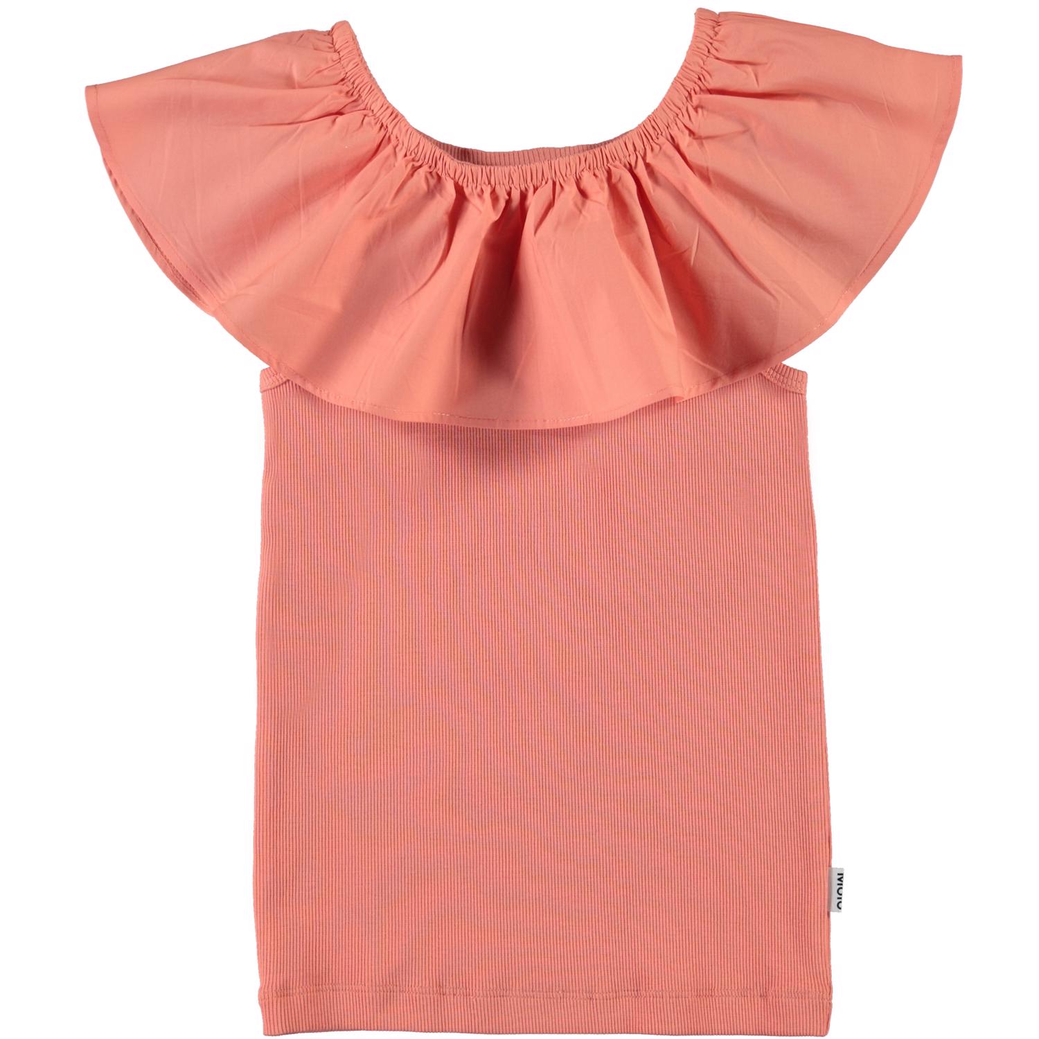 Reca is a coral coloured vest in rib with a large ruffle that can either be worn on the shoulders or off.