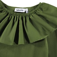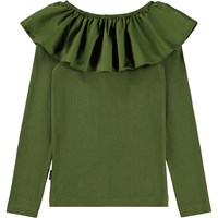 Bottle green, close-fitting long-sleeved top made of organic cotton rib with a poplin collar and elastic that can be worn off-shoulder or lifted up to function as both a collar and sleeve.