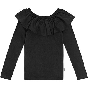 A black-fitted, long-sleeved blouse in organic cotton rib with a poplin collar with elastic that can be worn off-shoulder or lifted up to function as both a collar and sleeve.