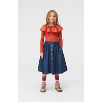 Renate is a long sleeve top in a burnt red colour. It is in a rib quality with a large ruffle collar that can be worn up or off the shoulders.