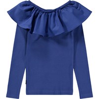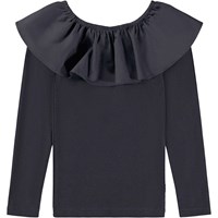 Dark blue, long sleeve top with a poplin collar. The poplin collar is elastic and can be worn either up as a collar or off the shoulders like sleeves. The body of this top is in 100% cotton jersey, and the collar is in 100% cotton poplin. It has long sleeves and is in a slim fit. It's a fun, versatile top for a lot of different occasions.