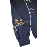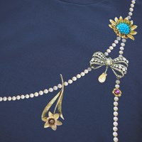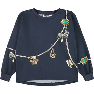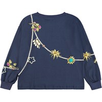 Dark blue long-sleeved top made of soft organic cotton with ribbed cuffs and neckline. The long-sleeved top has a loose fit and is longer at the back. The long-sleeved top has a print of beautiful royal pearl necklaces and colorful brooches with pearls and stones.