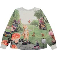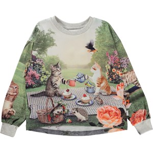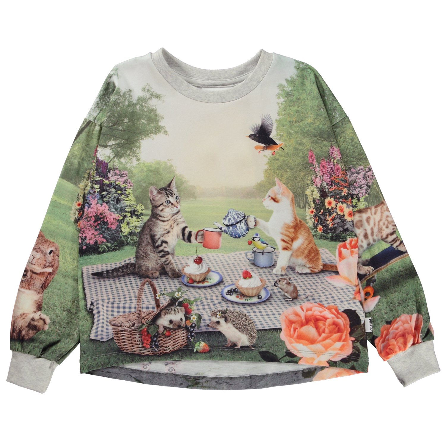 Reniza is a green top with long sleeves in organic cotton. Reniza is in the Kitty Picnic placement print on the front and back, which shows two cats are having a picnic in the park. The neck and sleeve edges are in a light grey melange.
