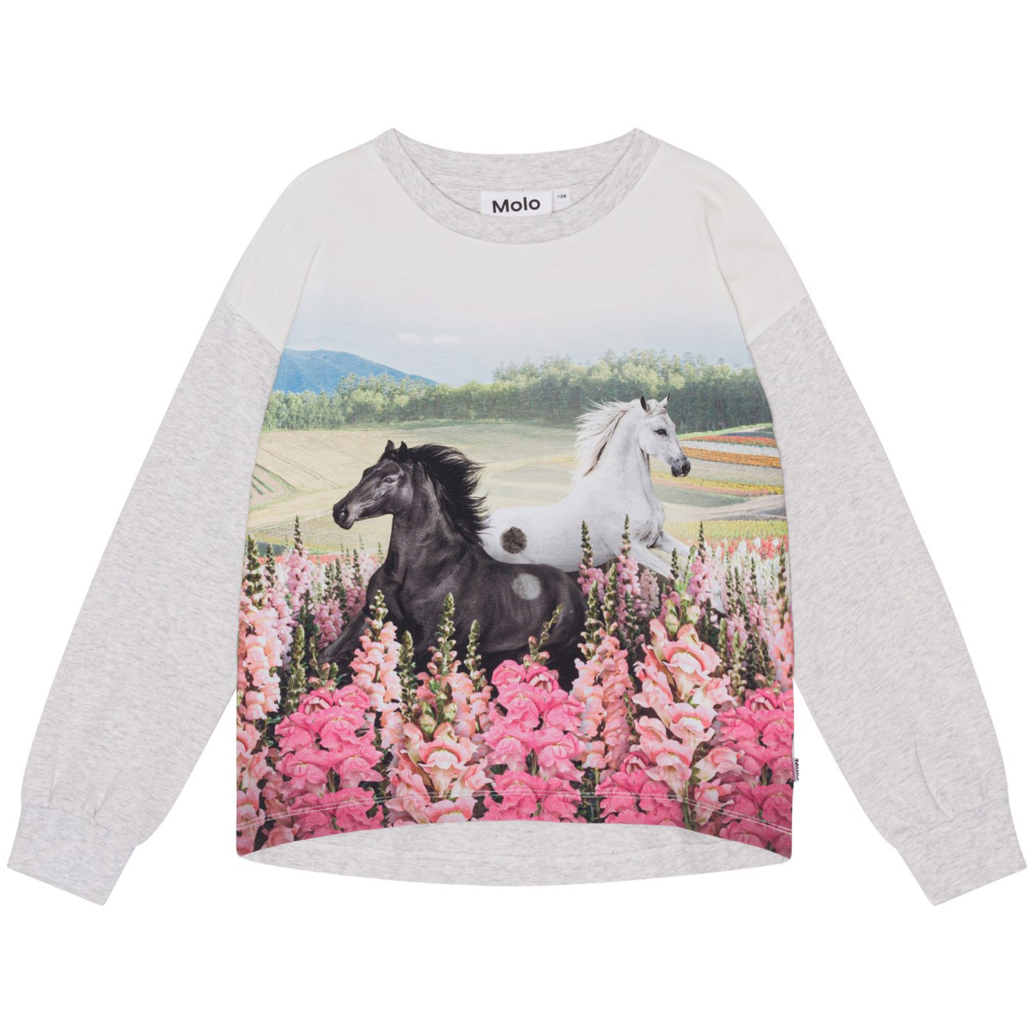 Long sleeve, light grey top in organic cotton with a print on the front of beautiful fields and galloping horses. The top is in a loose fit and has a rib edge at the neck and sleeves. It is slightly longer in the back.