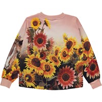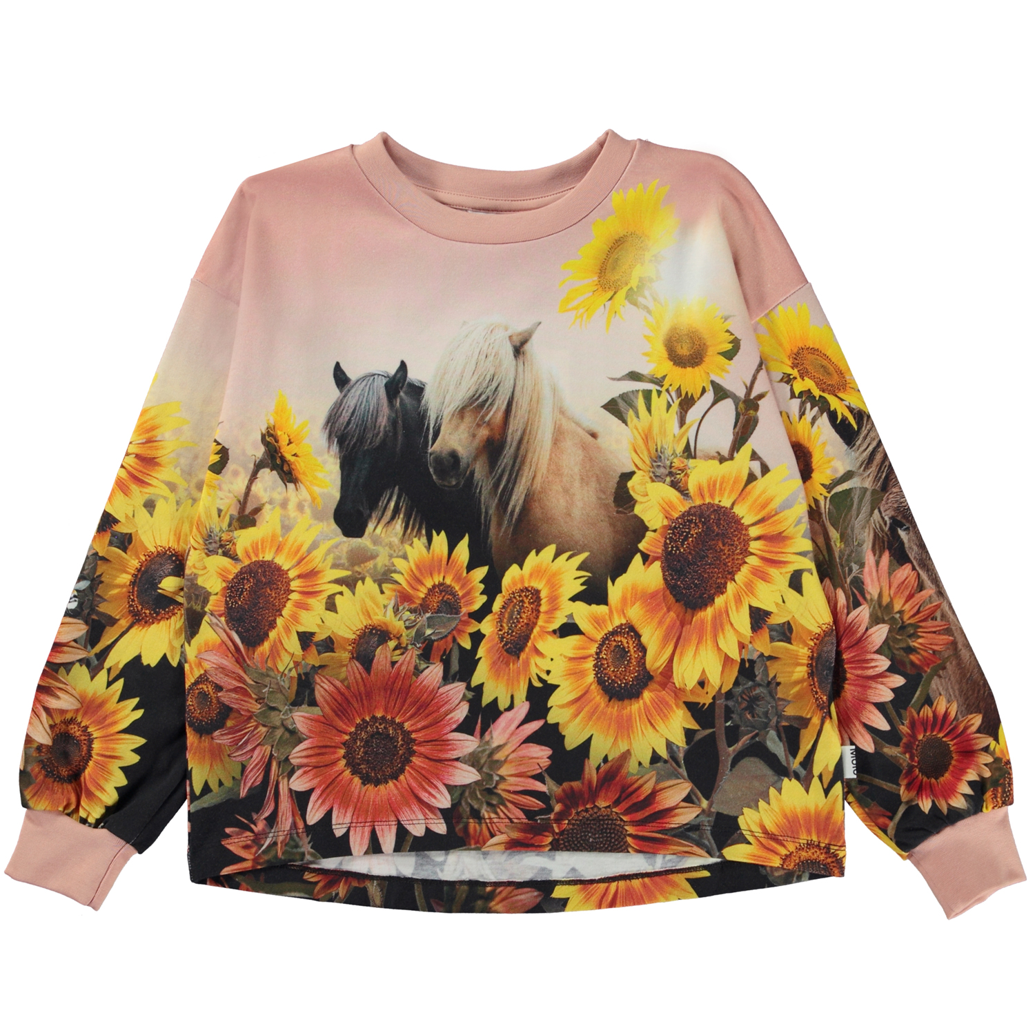 Rose coloured top with a placement print in shades of yellow and red. The print shows two sweet ponies that are on an adventure in a meadow full of sunflowers. The top is in 100% cotton jersey, has long sleeves with a rib edge, a round neck with rib and is in a loose fit.