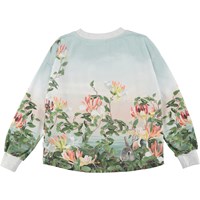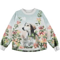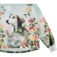 Reniza is a long sleeve top with a print of flowers, a dog and a rabbit. The top is slightly longer in the back.