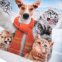 Blue and grey long-sleeved top made of soft organic cotton with ribbed cuffs and neckline. The long-sleeved top has a loose fit and is longer at the back. The long-sleeved top has a print of cute animals taking a selfie in a beautifully snow-covered landscape.