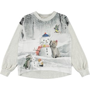 Reniza is a light grey top with a print of snowmen made by various animals. The top is slightly longer in the back.