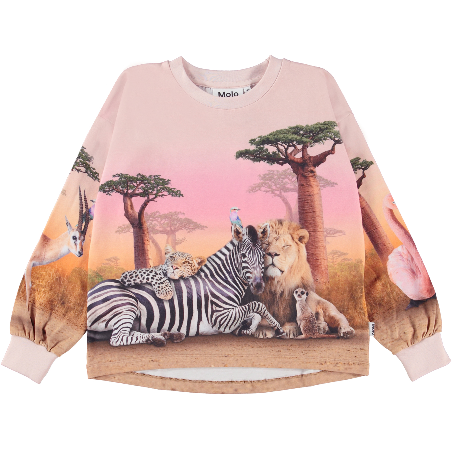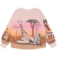 Reniza is a pink top with long sleeves in organic cotton. Reniza is in the Wild Wonderful placement print, on the front and back, that shows the animals of the savanna lying down together. The neck and sleeve edges are in pink.