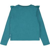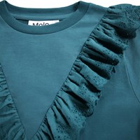Petroleum green, long-sleeved top made of organic cotton with a round neck and ribbed edge. The blouse has a regular fit and a ruffle edge of embroidery anglaise, running down in a V-shape at the front and back.