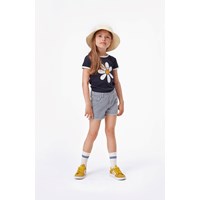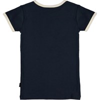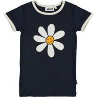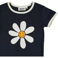 Rhiannon is a dark blue ringer t-shirt with white edges and a smiling daisy print on the front.