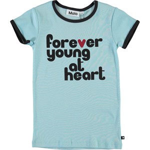 Forever young at heart' is the statement on the Rhiannon t-shirt. Unleash your playful side and stay forever young in this cool t-shirt. The t-shirt is a light blue ringer t-shirt with black edges at the sleeves and neck.