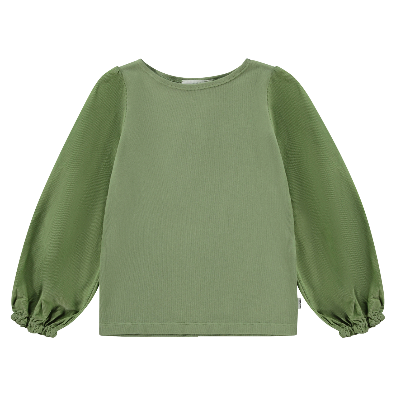 Green top with puff sleeves in cotton poplin. This top is in 100% cotton, has a round neck with a rib edge, long puff sleeves with elastic at the bottom and is in a regular fit.
