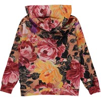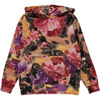 Rose coloured hoodie in a large floral, all over print in a rose colours and purples. The print is of beautiful, hand painted flowers. If you look closely, you can see the brush strokes. This print is truly special because its Molo's own, new version of a print that was created by a silk weaver in Lyon, France. The weaver has worked with all the great names in fashion like Givenchy, Balenciaga, Chanel, Dior and now also Molo kids. This hoodie is in 100% cotton jersey. has long sleeves, a pouch pocket on the front and is in a regular fit.