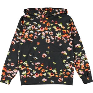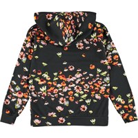 Rhona is a hoodie with long sleeves and a pouch pocket on the front. The hoodie is black with a print of colourful small flowers.