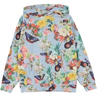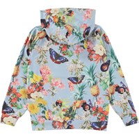 Light blue hoodie with a pouch pocket in organic cotton. Rhona is in the all over Tropical Fruits print, that shows clusters of tropical fruits, tropical flowers and butterflies.
