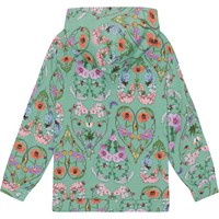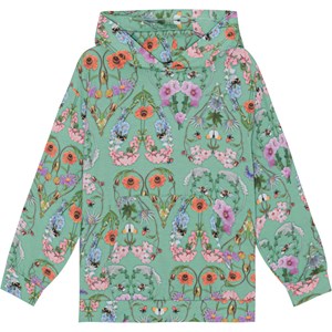 Long sleeve hoodie in organic cotton with a multi-coloured, all over print of insects and wild, colourful flowers that form hearts all over the t-shirt. The hoodie is in a regular shape with a drop shoulder, a pouch pocket and a rib edge at the neck, sleeves and bottom.