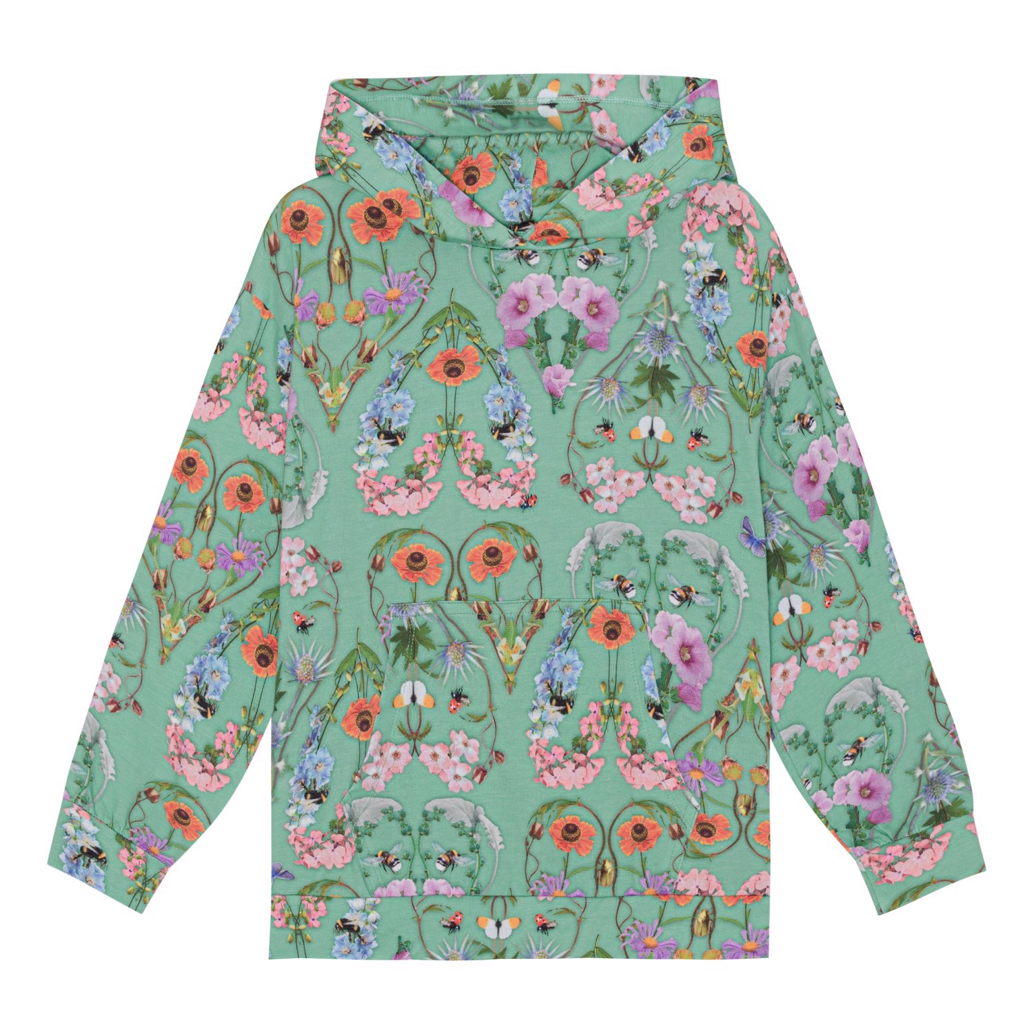 Long sleeve hoodie in organic cotton with a multi-coloured, all over print of insects and wild, colourful flowers that form hearts all over the t-shirt. The hoodie is in a regular shape with a drop shoulder, a pouch pocket and a rib edge at the neck, sleeves and bottom.