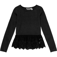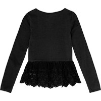 Black and fitted long-sleeved top in organic cotton rib with a corduroy ruffle trim from the waist down, adorned with a small flower pattern cutout.