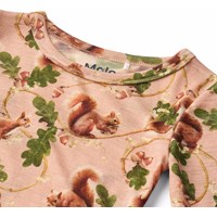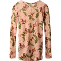 Pink melange, long-sleeved top made of soft merino wool with a close-fitting cut, a round neckline and babylock details at the sleeves and waist hem. The long-sleeved top has a print of squirrels on green oak branches. Combine with matching leggings in the same colour for a complete set.