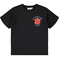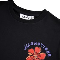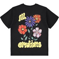 Black short-sleeved T-shirt made of soft organic cotton with a ribbed neckline. The T-shirt has a loose fit and a large colorful back print of flowers as well as the text "All emotions".