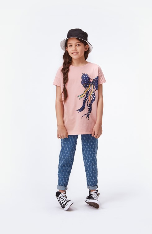 Rilla is a rose coloured t-shirt with short sleeves and a print of a blue polka dot bow on the front.