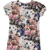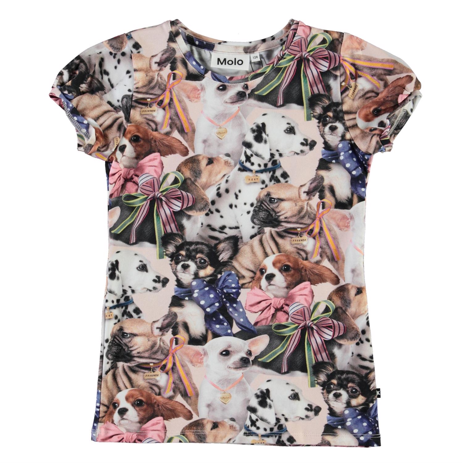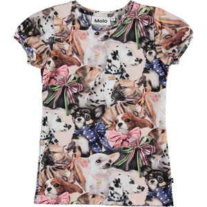 Rimona is a t-shirt with a print of small dogs with ribbons around their necks. The t-shirt has short sleeves and grey edge tape.