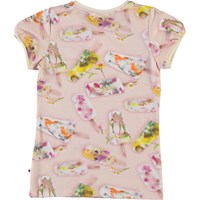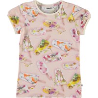 Rimona is a pink t-shirt with an ice cream print. Molo has frozen these flowers for the print. The t-shirt has short sleeves and a grey edge tape.