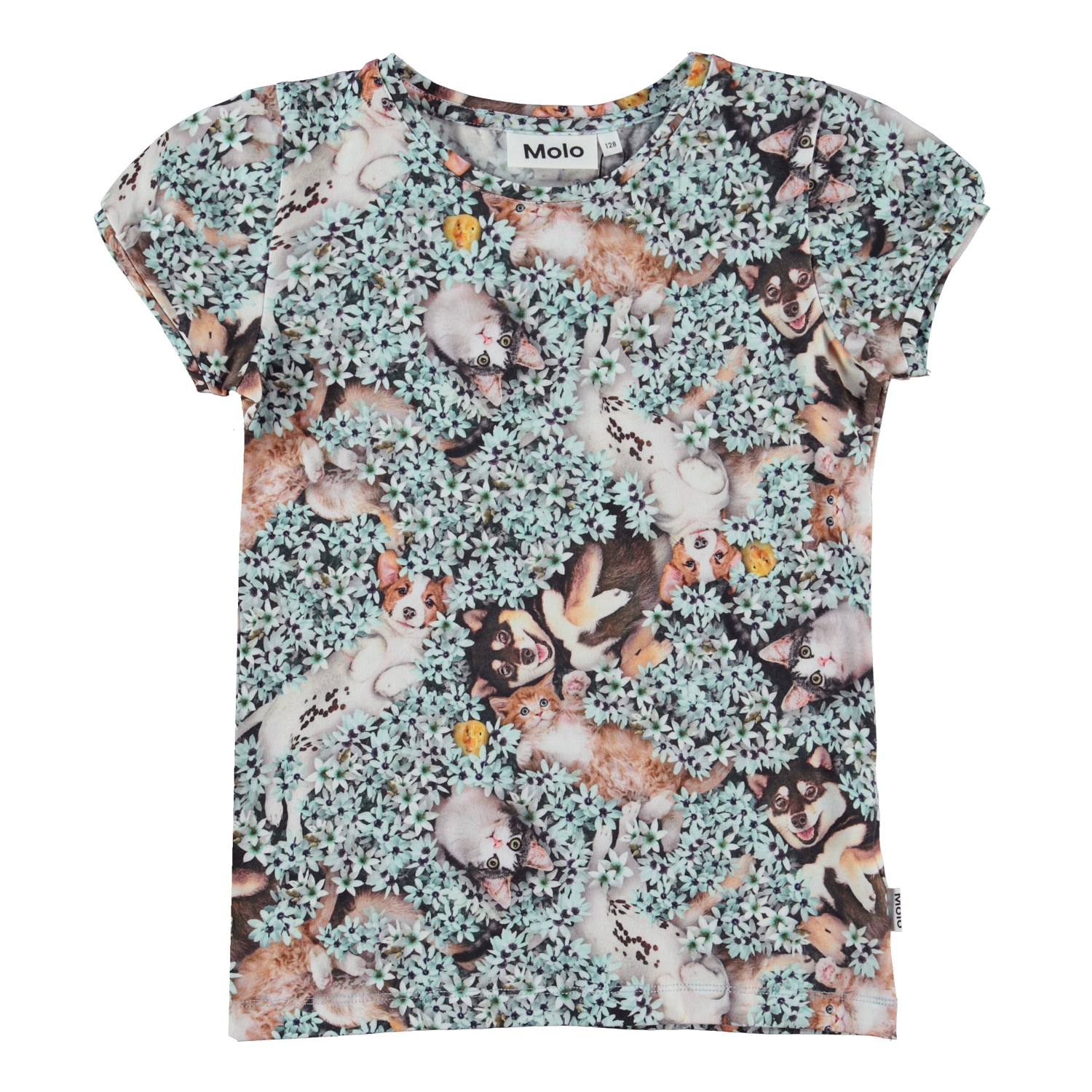 Rimona is a top in organic cotton with cap sleeves. The top is in the all over Park Life print, where puppies and kittens roll around in a blue meadow of flowers.