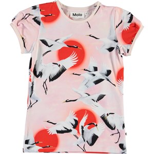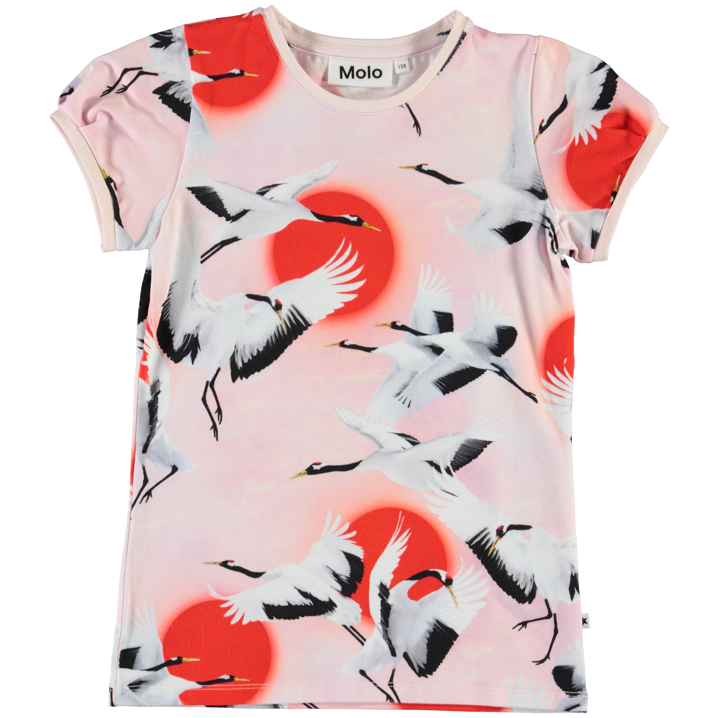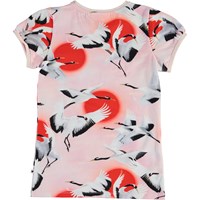 Rimona is a pink t-shirt with a print of large red dots and flying cranes. The t-shirt has very short sleeves and matching pink edge tape.